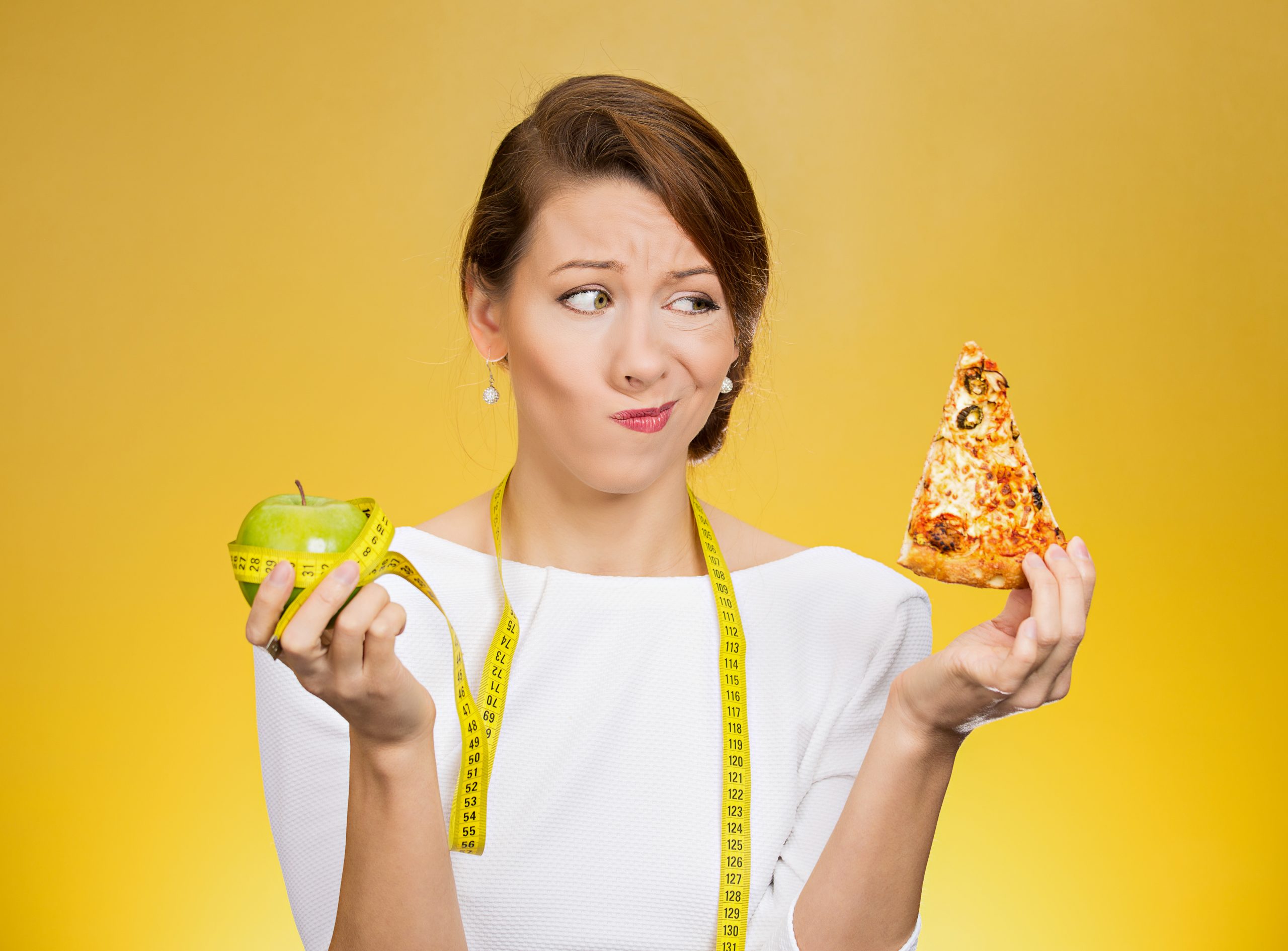 A woman deciding what to eat. She is fighting her cravings and is conscious about her weight.