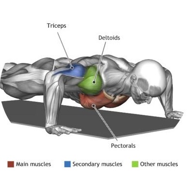 Your spine, stomach, chest, shoulders, biceps, triceps and a whole lot of other muscles will feel the strain of the push up; mainly the muscle groups of pectoral muscles and anterior deltoids are affected.