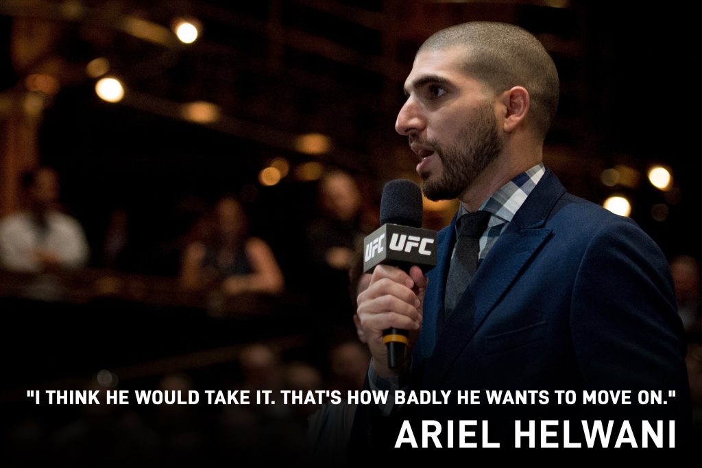 “Why is it a bogus offer? The only reason it was offered was two-fold… either A: If you’re gonna leave us, you’re gonna leave on a loss or B: You’re gonna turn this down, your contract will be extended. Those are the only reasons, there was never a true genuine interest, there was not a true genuine demand to see this fight. So the only reason it’s offered is for those two reasons… and that’s why it’s bogus.”