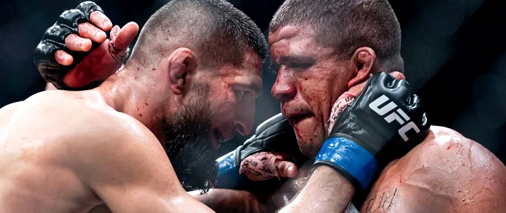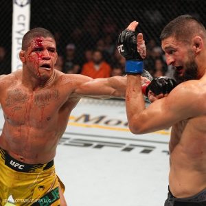 Round 1 started at a high pace from Khamzat, seemingly looking for an early knockout with his outstanding power. However despite getting solid contact on Burns and wobbling him a few times he was unable to find a finish. The pressure from the Smesh King didn’t stop there he carried it into combinations of strong jabs, followed by a wicked elbow that sliced open Gilbert’s forehead and a takedown that led to ground and pound, the round was massively in Borzs’ favor. Though Burns took every punch and jab seemingly undeterred from the pressure and returned hammerfists as often as he got hit. There were multiple moments throughout the match (5 in total) where Durinho attempted a takedown and Khamzats overwhelming strength not only prevailed but showed alarming immobility despite Durinhos strength. Such an exchange of power induced a jaw dropping reaction from the audience, something truly unique was witnessed.