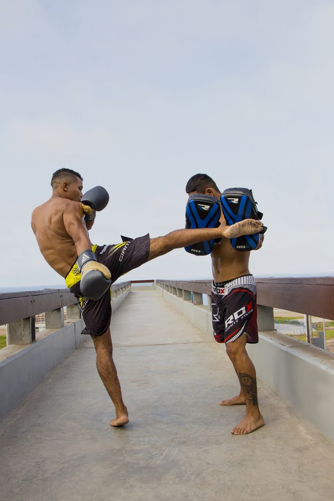 Furthermore the styles of training for both Muay Thai and Kickboxing greatly vary when it comes down to hand and elbow strikes. With much greater emphasis being given in Muay Thai to elbow strikes and not as much in kickboxing. When it comes down to kicking, however, the similarities in types and techniques of strikes are much more similar, low kicks, spinning kicks, heel and roundhouse kicks being commonly found in both fighting styles. Similarly the training and combat equipment for both fighting styles are more or less the same. However in training Muay Thai is clearly more relentless in its methodology. Training a fighter’s body to withstand pain and tolerate damage with multiple strikes from the team. Whereas kickboxing pads and training allows the fighter to face the same trial over time and through sparring.