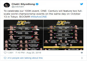 ONE CEO Chatri Sityodtong announced the matchup on Sunday for the upcoming championship in Tokyo. The two-part championship is set to launch on October 13 celebrating their 100th event. Part 1 includes Angela Lee (9-2) defending Atomweight (115 pounds) against Jingnan Xiong (14-1). Fans are excited for Lee’s return after losing consecutively in the 125-pounds weight class.