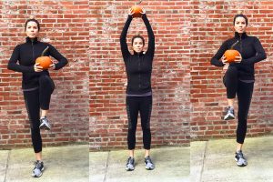 This is a great balance move and targets your glutes, low back, and hamstrings. Holding the pumpkin, find a place of balance on one foot. While standing on one leg with a little give in the knee, hinge at the hips as you lower your pumpkin to the ground and raise the other leg behind you. Squeeze the glute of the raised leg, and then, using the hamstrings and glutes, lift your body back to starting position. Make sure your supporting leg is slightly bent and your back is flat. Aim for three sets of 10 on each leg.