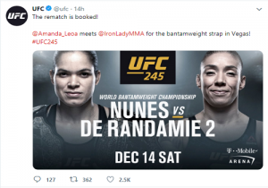 The fight will feature a champ-champ bout on December 14, 2019 in Las Vegas, Nevada. UFC promotion confirms the 135-pound title-fight between the contenders. Fans are excited as both meet again after UFC first Night 31 in 2013. The fight took place in Fort Campbell, Kentucky and Nunes won the match via first round knockout. This won her both Bantamweight and Featherweight straps.