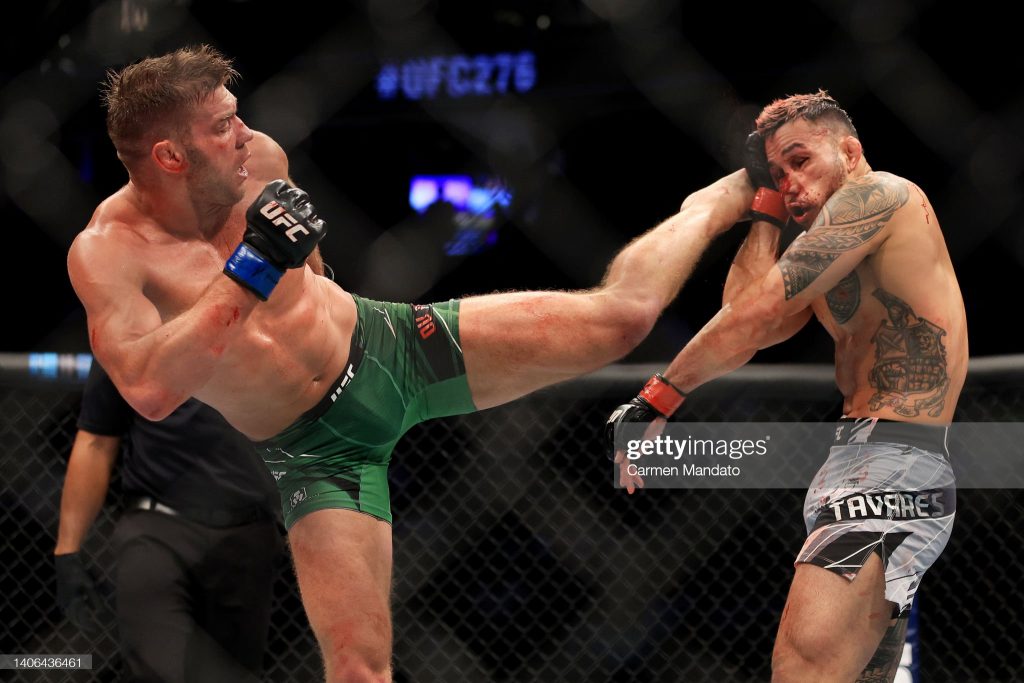LAS VEGAS, NEVADA – JULY 02: Dricus Du Plessis (L) of South Africa kicks Brad Tavares in their middleweight bout during UFC 276. At T-Mobile Arena on July 02, 2022 in Las Vegas, Nevada. (Photo by Carmen Mandato/Getty Images)