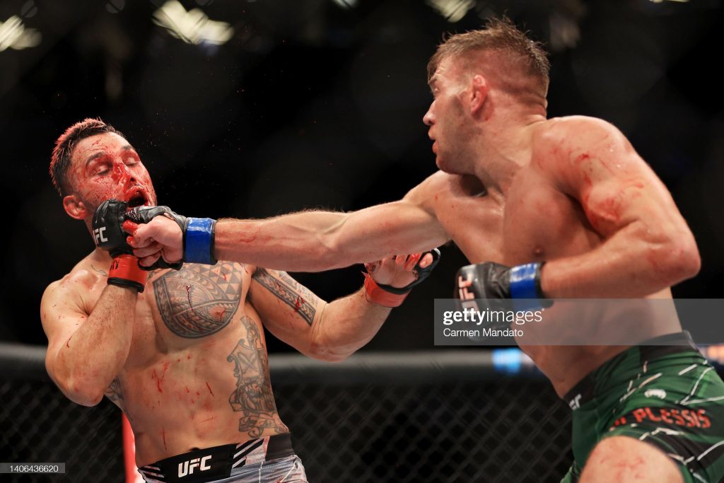 LAS VEGAS, NEVADA – JULY 02: Dricus Du Plessis (R) of South Africa punches Brad Tavares in their middleweight bout during UFC 276. At T-Mobile Arena on July 02, 2022 in Las Vegas, Nevada. (Photo by Carmen Mandato/Getty Images)