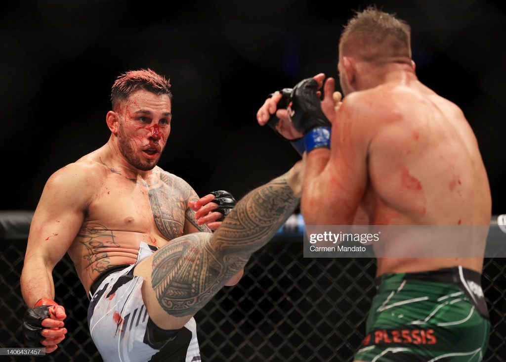 But The RDX Fight Of The Night goes to Brad Tavares Vs Dricus Du Plessis for an amazing showcase of willpower and strength. To start, what an excellent match up between two brilliant fighters at an equal level. No other match up presented as much equal possibility of winning or losing than this fight. Round 1 favored Tavares ever so slightly for his counters and reversals. Both Round 2 and 3 favored Du Plessis however and once more, not by much. Both rounds saw Du Plessis do damage to the face of Tavares, yet Tavares stood strong. Blood still pouring out of a cut on the nose of Tavares, he remained an immovable obstacle against his opponents pressure, throughout the match.
